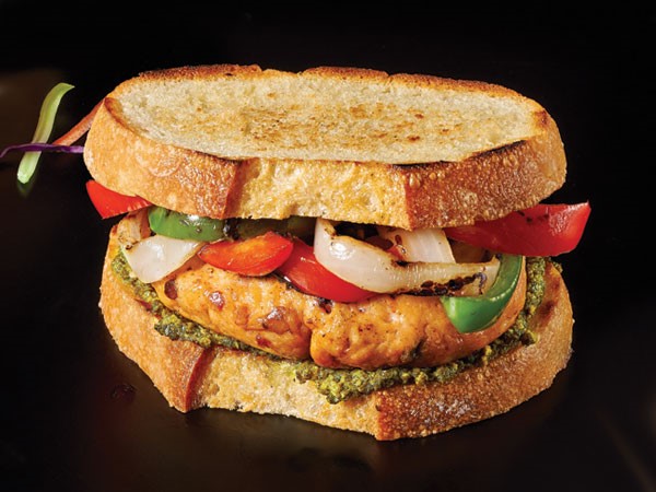 Grill a Hy-Vee-exclusive Cowgirl Chicken Griller burger. Spread Gustare Vita basil pesto on Hy-Vee Toscano bread slices; toasted. Top with Hy-Vee Short Cuts peppers and onions; grilled.