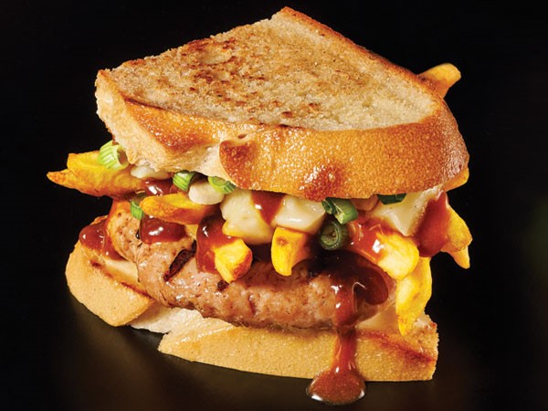 Grill a ground pork burger. Spread garlic butter on Hy-Vee Bakery Sourdough bread slices; toast. Top with crisp French fries, Hy-Vee brown gravy, fresh cheese curds, and sliced green onions.