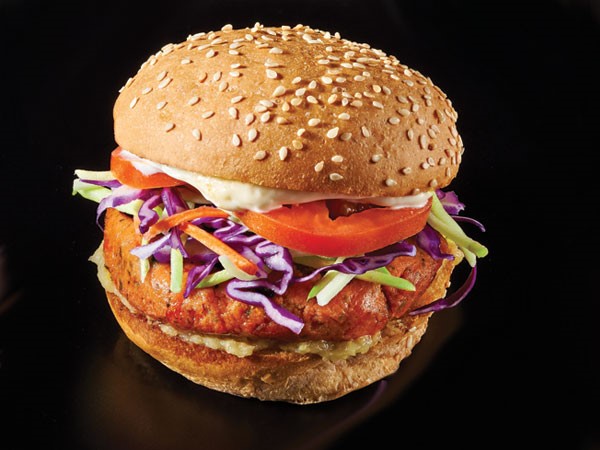 Grill a classic salmon burger. Combine mayo and ginger paste; spread on a Hy-Vee Bakery sesame bun. Top with broccoli slaw, shredded red cabbage, and tomato slices.
