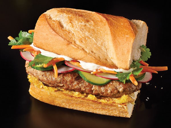 Grill a ground turkey burger. Combine mayo and lemongrass paste; spread on a quartered Hy-Vee Bakery French baguette. Top with seedless cucumber; sliced, pre-shredded carrots, radish slices, and fresh cilantro leaves.