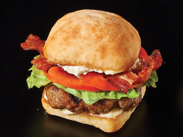 Grill a beer bratwurst burger and spread a ciabatta bun with parmesan-lemon mayo. Top with crisp-cooked Hy-Vee bacon, iceberg lettuce, and tomato slices.