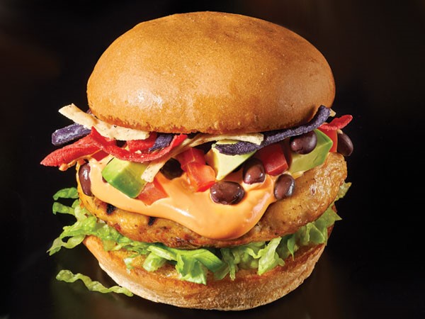 Grill a Hy-Vee-exclusive Cowboy Chicken Griller Burger. Spread nacho cheese sauce on a Hy-Vee Bakery plain burger bun. Top with chopped tomato, avocado, black beans, chopped iceberg lettuce, and fried tortilla strips.