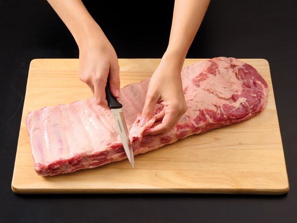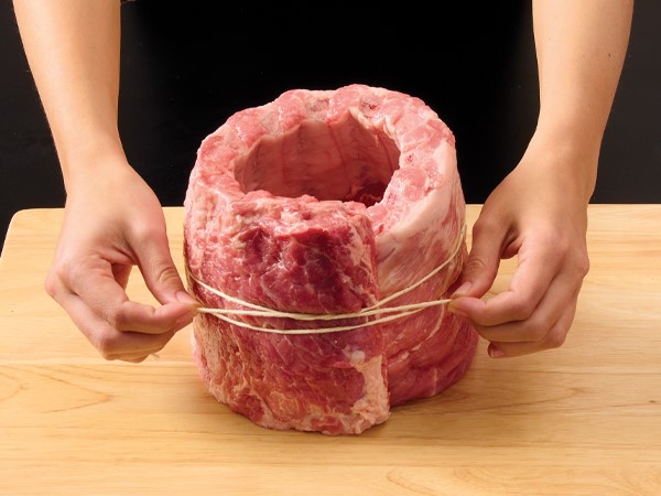 Shape the rack into a circle. Tie the ribs tightly together using kitchen twine or pin the ends with metal skewers.