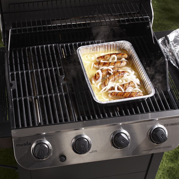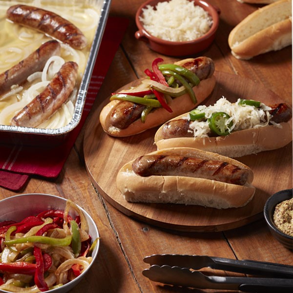 We love beer brats! Char them on the grill and finish cooking them in a aluminum pan filled with beer, chicken broth, and onions to keep them juicy and flavorful. Or, grill them and keep them warm in this mixture so everything's ready when everyone is ready to dig in.
