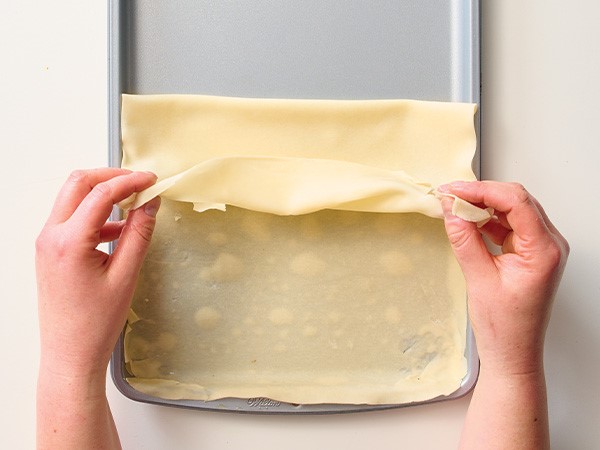 Cover rimmed pan with rolled-out pie crust. Brush egg wash o edges of crust.