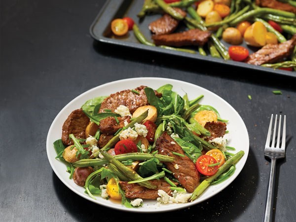 Give your sirloin steak a dip in a savory marinade for about 30 minutes. Then slice it thin and pop it in the oven with the roasting potatoes. Because every salad should have meat AND potatoes.