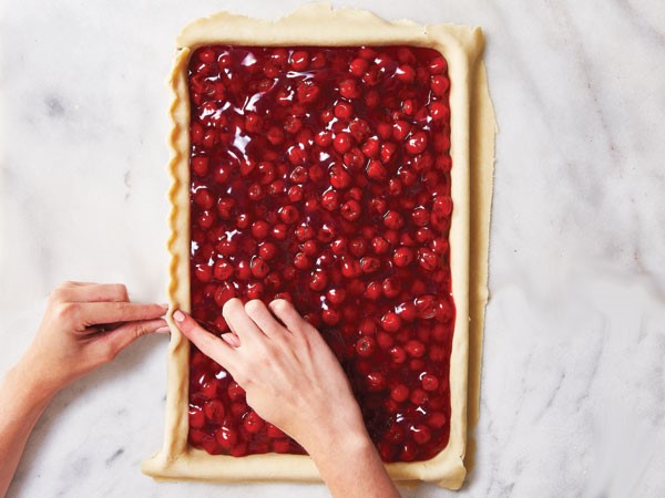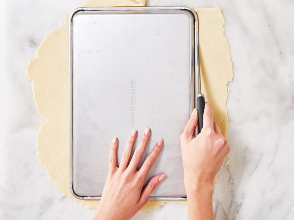 Roll out one portion of pie pastry into a 15x10x1-inch rectangle. Lay the 15x10x1-inch baking pan upside down on the pastry and cut around the edges with a sharp knife.