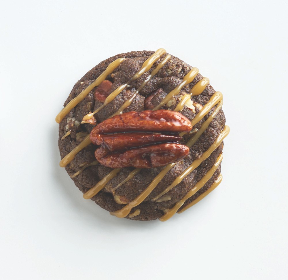 5. Drizzle caramel mixture over cooled cookies and top each with a candied pecan. Makes 60.