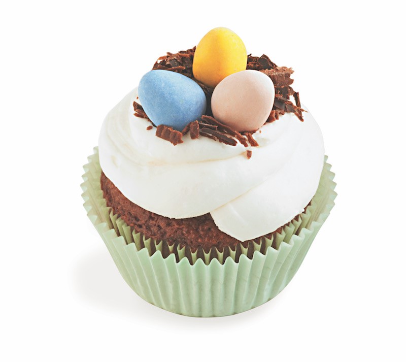No special piping tips needed—just frost with vanilla frosting and top with chocolate shavings to make a nest. Then place the candy eggs on top.