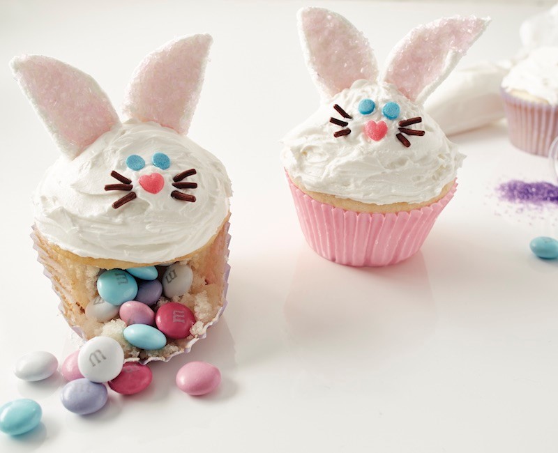 Scoop out a plain Hy-Vee cupcake, tuck in candies, pop the top back on and frost. Use sprinkles for a face, and give him his ears by cutting triangles out of jumbo marshmallows.