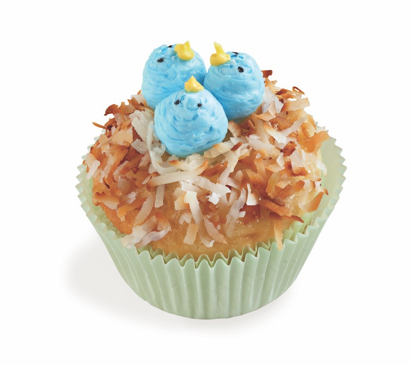 Lightly frost the top of the cupcake with frosting; then cover with toasted coconut to make the Robin's nest. Then you can dab on colored frosting to make baby birds.