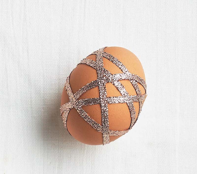 Beautify brown eggs by wrapping them with thin ribbon and securing the ends with tape. Try this on white eggs too, using ribbon in various fun patterns.