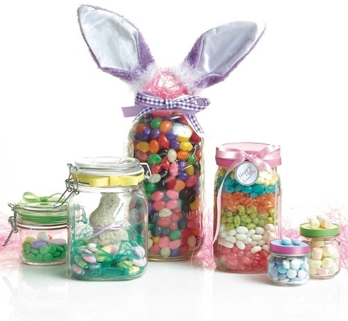 Fill jars with colorful Easter candy—you can even do it in layers for a special effect. Then top with bunny ears or ribbon for an even more playful look.