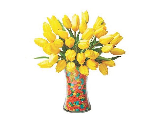 Cut the stem ends of a tulip bouquet, then place flowers in a vase of water. Set that vase in a larger clear plastic vase, then fill the space between the vases with colorful jelly beans.