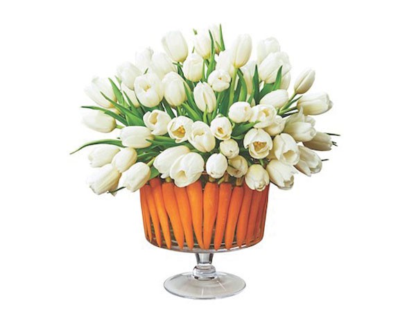 Use the same method as the Candy Vase Bouquet, only fill the space between the vases with whole peeled carrots, stems still attached. Asparagus also works wonderfully.