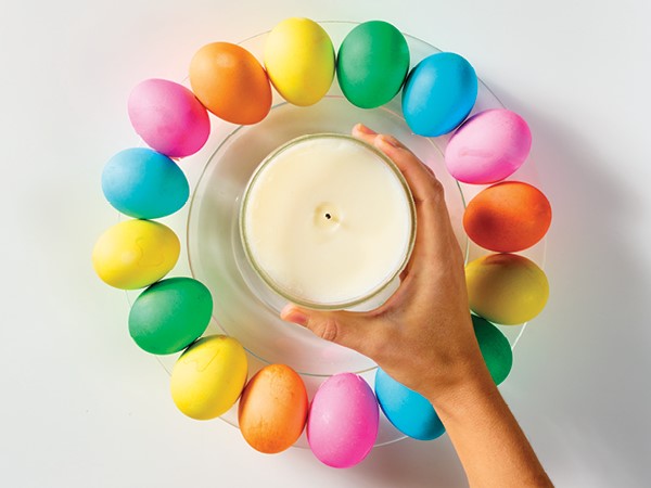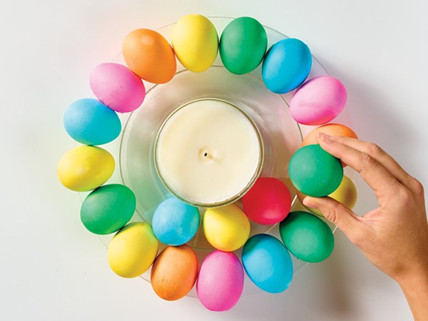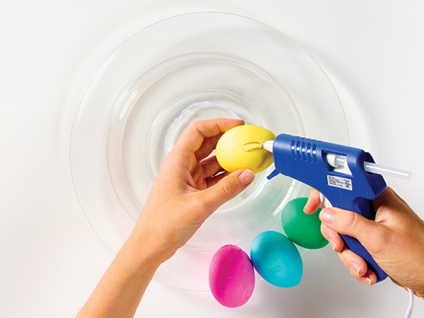 Glue on Eggs: Hot-glue dyed hard-boiled eggs in alternating colors onto the rim of the large plate so they encircle the smaller plate
