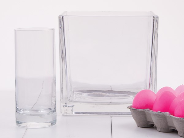 Gather a large vase, a small vase or water glass, dyed eggs, ribbon, and a Hy-Vee bouquet.