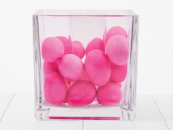 Slowly and evenly place the dyed eggs to completely hide the glass centered in the large vase.