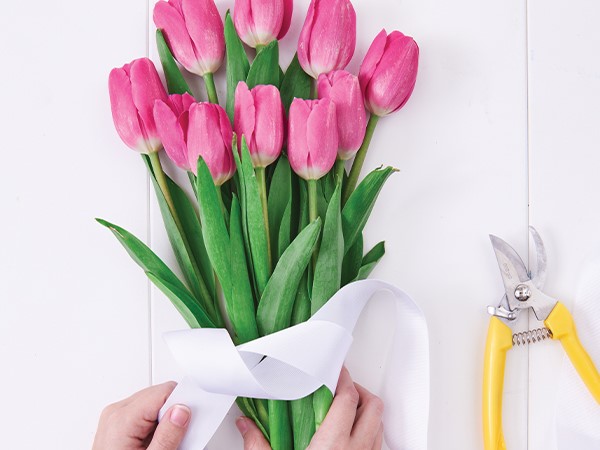 Trim stems to desired length. Place in water and arrange; tie a ribbon around the stems.