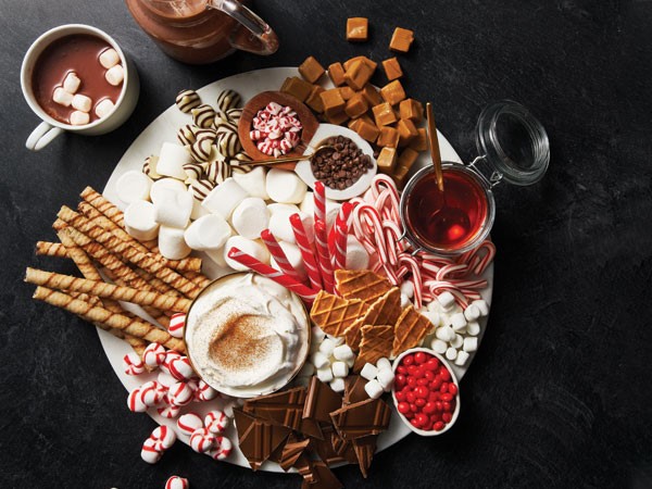 What we used: Caramels, cinnamon Red Hots, crushed peppermint candies, Culinary Tours Belgian waffle crisps, Hershey's Hugs, Hy-Vee chocolate chips, Hy-Vee marshmallows, Hy-Vee Select pure maple syrup, mini candy canes, peppermint sticks, Pepperidge Farms pirouette cookies, Soft peppermint candies, whipped cream garnished with ground cinnamon, Zoet dark chocolate bars.