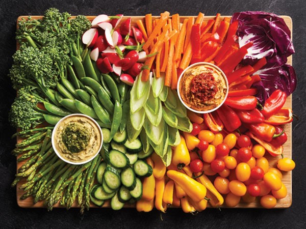 What we used: Asparagus spears, Belgian endive leaves, broccolini spears, carrot sticks, cherry and grape tomatoes, English cucumber slices, radicchio leaves, radishes, red pepper hummus, red, yellow and orange sweet bell peppers, salsa verde hummus, sugar snap peas