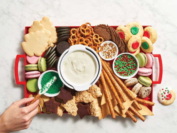 What we used: Almond cookie brittle, cinnamon crisps, gold and white sugar pearls, green jimmy sprinkles, Hy-Vee Bakery brownies (cut into stars), Hy-Vee Bakery Gourmet macarons, Hy-Vee Bakery sugar cookies, Hy-Vee Bakery Thumbprint cookies, Hy-Vee pretzel rods, Hy-Vee red and green sprinkles, Hy-Vee tiny twist pretzels, Pepperidge Farms mint chocolate Milano cookies, pistachio creme Oreo thins, pre-made Rice Krispies treats (cut into bells), white chocolate fondue.