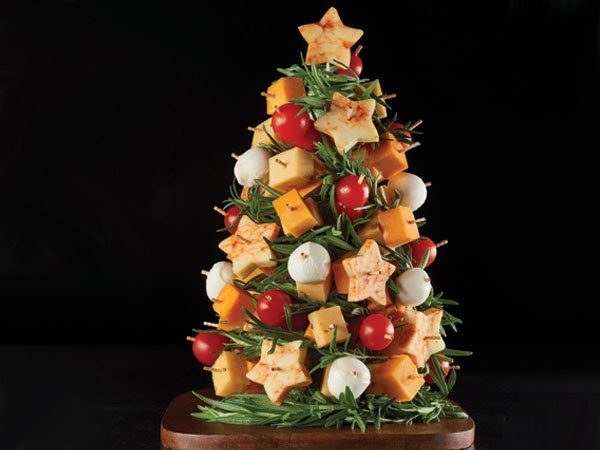 Want a memorable cheeseboard? Make a tree "board." Cover a foam cone with plastic wrap and set on a platter. Use a knife to cut cheese into cubes and a cookie cutter to form stars. Attach cheese, mozzarella balls, and cherry tomatoes to the foam cone with Simply Done designer toothpicks from Hy-Vee. Fill gaps with rosemary sprigs.