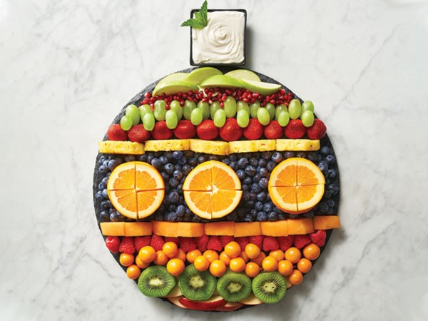 What we used: Apple wedges, blueberries, cantaloupe cubes, Hy-Vee fruit dip, golden berries, grapes, kiwi slices, mint garnish, orange slices, pineapple slices, pomegranate seeds, raspberries, strawberries.