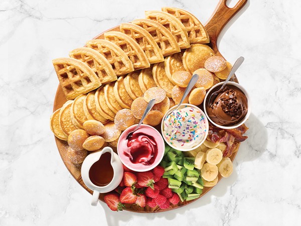 What we used: Hot waffles, hot 2-1/2-to-3-inch pancakes, heated Hy-Vee frozen traditional mini pancake bites, Hy-Vee hazelnut creamy spread with skim milk and cocoa garnished with mini chocolate chips, Hy-Vee thawed frozen whipped topping garnished with sprinkles, strawberry cream cheese fruit dip swirled with strawberry jam, Hy-Vee Select 100% pure maple syrup, crisp-cooked Hy-Vee sweet smoked bacon, sliced bananas, chopped kiwi, raspberries, halved strawberries.