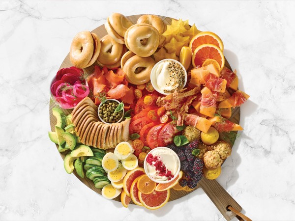 What we used: Hy-Vee plain bagel juniors, Hy-Vee whipped cream cheese spread garnished with Culinary Tours everything bagel seasoning and crushed freeze-dried raspberries, star fruit slices, Cara Cara orange slices, Mandarin orange slices, peeled cantaloupe wedges wrapped with prosciutto, mini muffins, blackberries, Hy-Vee hard-boiled egg halves, English cucumber slices, avocado slices, pickled beets, pickled red onions, party bread Jewish rye, Gustare Vita capers, Hy-Vee Fish Market smoked Atlantic salmon, tomato slices garnished with salt-free tomato-basil seasoning and cracked black pepper, halved cherry tomatoes, crisp-cooked Hy-Vee bacon.