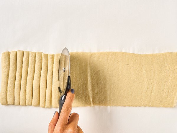 Roll out 1 (13.8-oz.) can of refrigerated classic pizza crust onto a 14x9-inch rectangle on parchment paper. Cut dough lengthwise in half; set aside one portion. Cut 24 strips, each 1/2-inch wide, from remaining half.