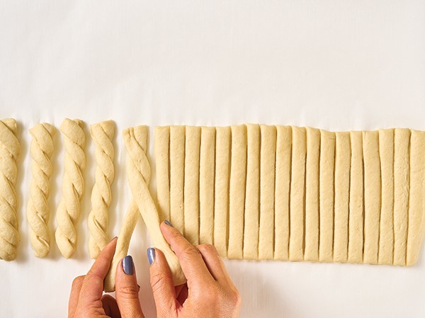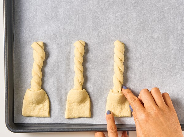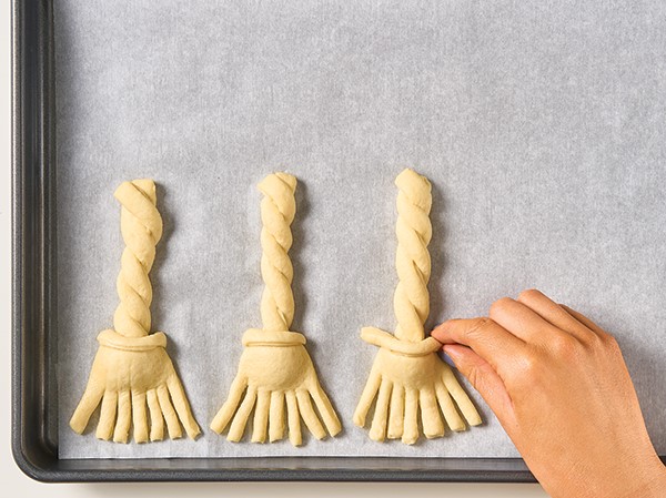Twist two dough strips together to form broom handles; repeat to form 12 total broom handles.