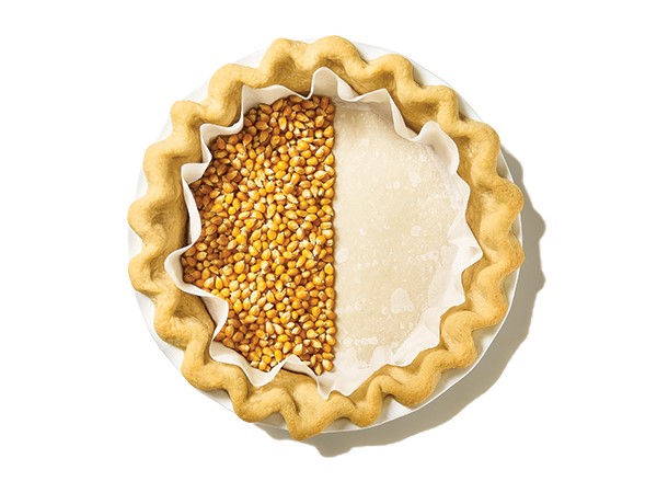 When using popcorn kernels, line the crust with parchment paper, then fill two-thirds full with popcorn kernels. Chill, then bake—popcorn will not pop when baked at 400 degrees or below. Remove the popcorn and paper. Use a fork to prick the crust bottom all over to prevent bubbles and continue baking until the crust is golden in color.