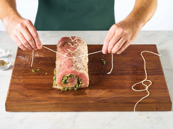 4. Starting at the long edge, tightly roll the pork loin. Tie kitchen string at 1-inch intervals to hold it together.