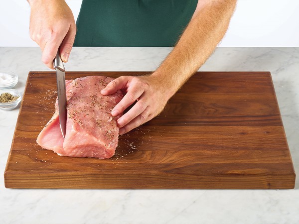 1. Place pork loin lengthwise on cutting board. Slice lengthwise 1/2-inch into one side of the pork loin.