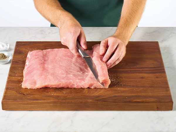 2. Holding the knife parallel to the cutting board, slice and unroll the pork until it's a 1-inch-thick rectangle. If the thickness is uneven, place a large piece of plastic wrap on top of pork and lightly pound with the flat side of a meat mallet.