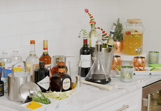 Make sure your home bar counter or cabinet is ready for holiday guests! Here are types of liquor, mixers, bitters and bar tools every mixologist should have; then kick your party off with a festive apple cider Moscow mule mocktail.