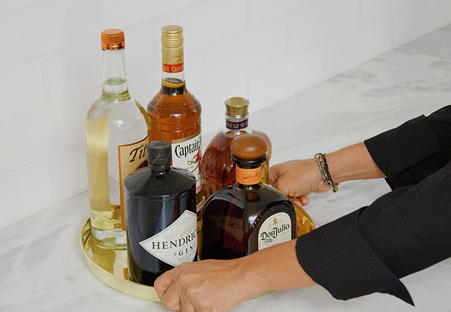 Gather a variety of liquors on a stylish tray. This may include gin, vodka, whisky, tequila and more. You may want to add nonalcoholic spirits like Clean V from Clean Co., an apple vodka alternative.