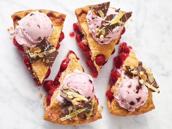 Top slices of cherry pie with It's Your Churn black jack cherry ice cream and chocolate bark.