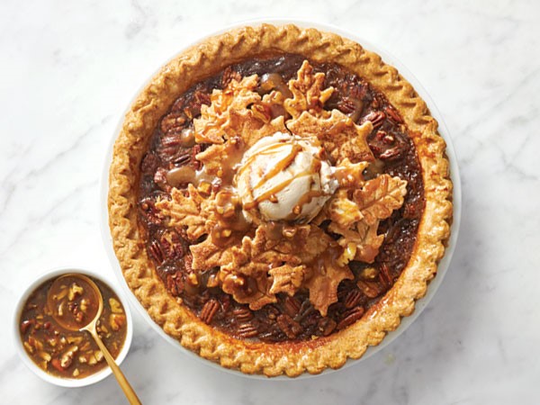 Pile a few spiced pasty leaves on a Hy-Vee Bakery whiskey pecan pie. Add a scoop of It's Your Churn salted caramel ice cream and pour on homemade caramel-pecan sauce.