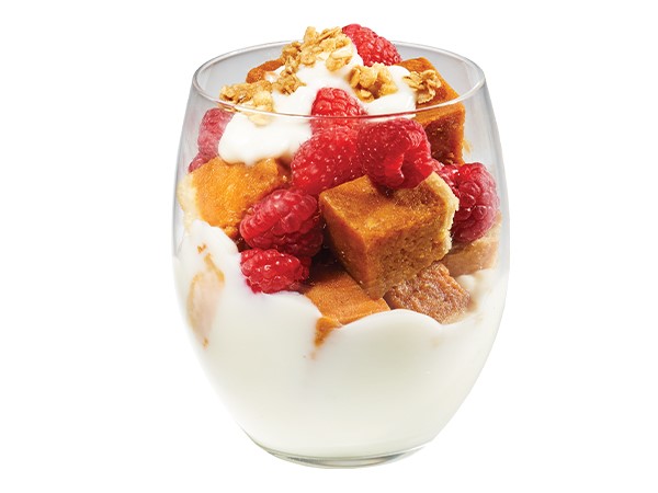 Cut 1 slice Hy-Vee Bakery pumpkin pie into cubes. In a 12-oz. glass, layer desired amount of Hy-Vee vanilla low-fat yogurt, pie cubes, and raspberries. Top with a spoonful of yogurt and granola. Serves 1.