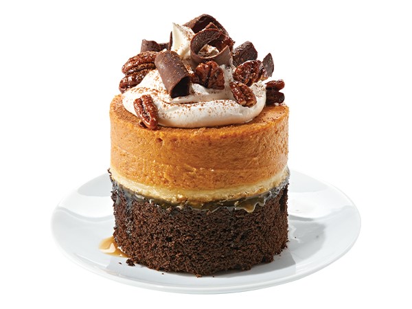 Cut 1 (12-inch) Hy-Vee bakery pumpkin pie into 8 (3-inch each) rounds using a cookie cutter. Cut 8 (3-inch each) rounds of Hy-Vee Bakery unfrosted chocolate cake. Spread 1 teaspoon caramel sauce on each cake round; set a pumpkin pie round on top. Top with thawed frozen Hy-Vee whipped topping. Garnish with chopped toasted Hy-Vee pecans and chocolate curls, and sprinkle with Hy-Vee baking cocoa, if desired. Serves 8.