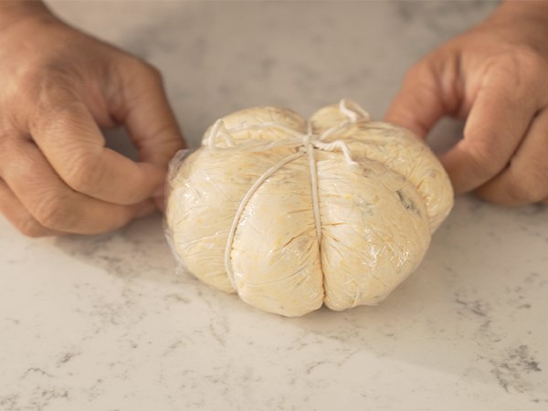 To create pumpkin ridges, wrap 4 pieces of twine or rubber bands around the cheeseball. Refrigerate for 1 hour or until firm.