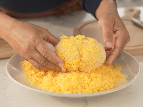 Once firm, remove twine or rubber bands and plastic wrap. Roll in extra shredded cheese or everything bagel seasoning, if desired.