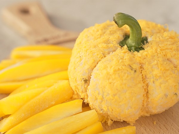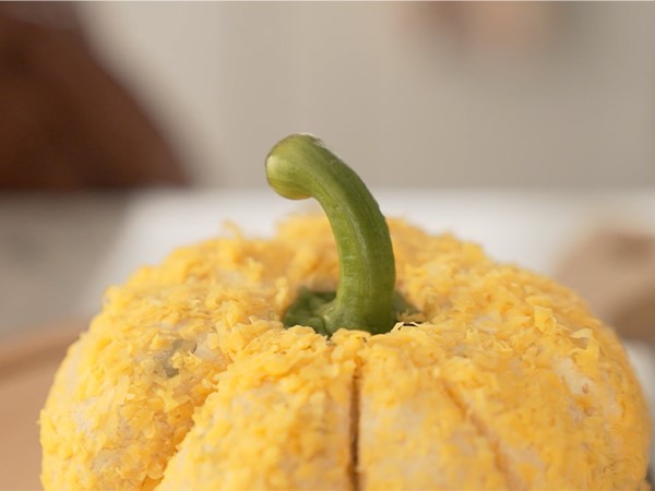 Remove stem from bell pepper and press into top of cheeseball as the pumpkin stem.
