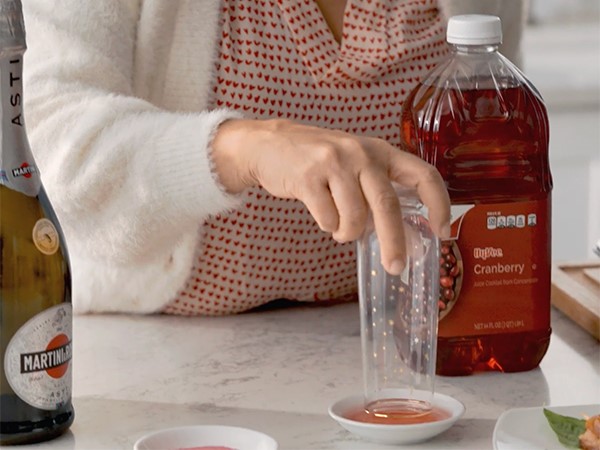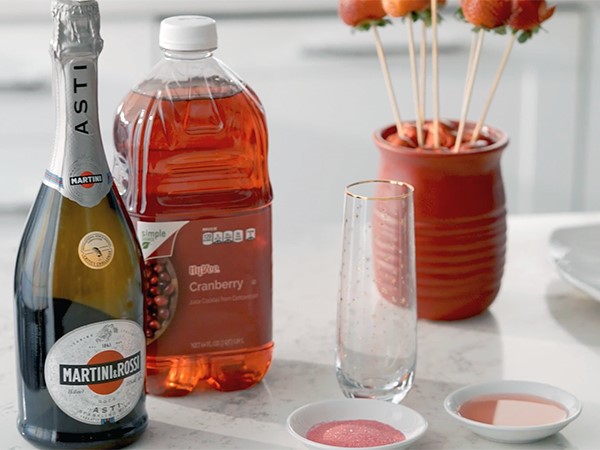 Gather your ingredients and tools: Hy-Vee cranberry juice, champagne or sparkling wine, pink sanding sugar, two stemless champagne flutes and two small dishes.
