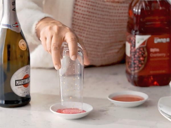 Fill one small dish with cranberry juice and one small dish with pink sanding sugar. Holding the bottom of champagne flute, dip rim into cranberry juice dish to wet rim of glass.