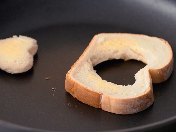 2. Toast both pieces of bread in skillet over medium heat. Once golden brown, flip both pieces over to toast other side. As second side of bread toasts, add butter inside heart-shaped hole of bread.