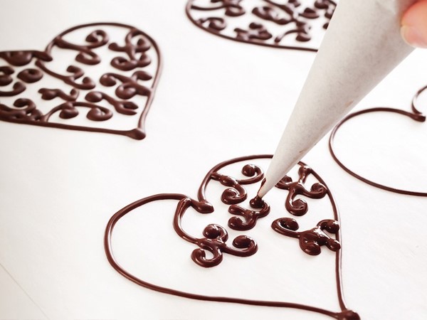 Line a baking sheet with parchment paper. Squeeze the chocolate out in a thin line onto the parchment, making a heart or design. Then freeze for 20 minutes. Once set, use a spatula to gently remove your design.