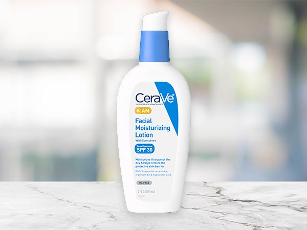 The optimal base for makeup is a hydrated one. Start your routine with a face moisturizer that has SPF for crucial sun protection. We like CeraVe AM Facial Moisturizing Lotion SPF 30.